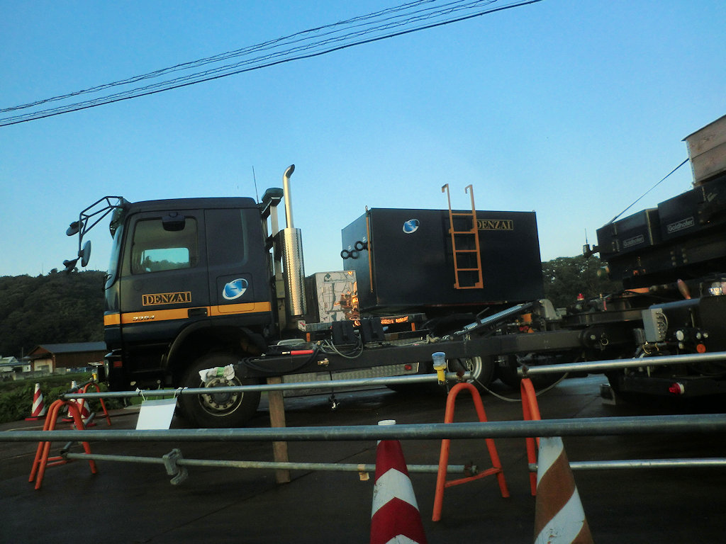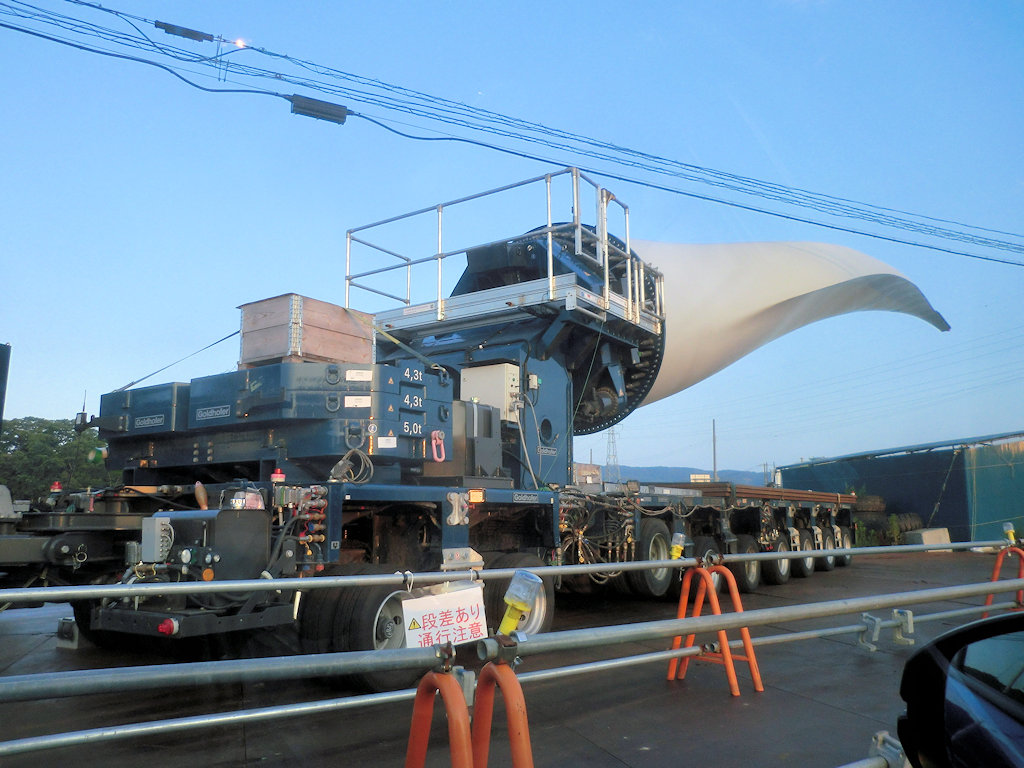 現場へ行く途中、巨大な物を観た。風力発電のブレード。地上で見るとかなり大きい。この車輪の多さよ。