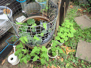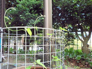 庭の大型プランター(咲かない睡蓮とメダカがいる)の周りに夏の日差し避け用に植えた朝顔がようやく蔓を伸ばし始めた。奥は一緒の時期に植えたゴーヤ。