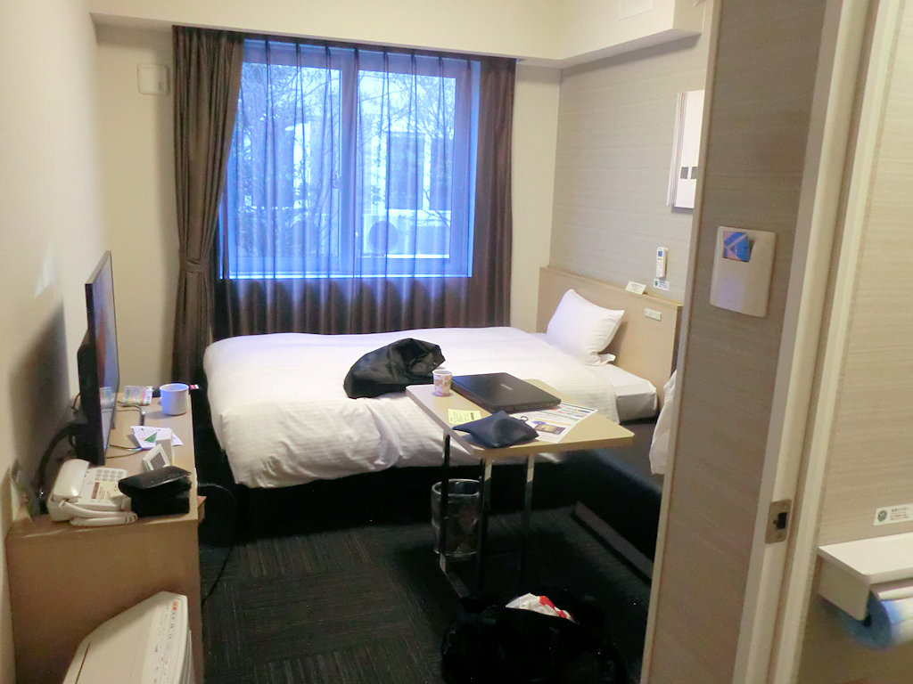 コンパクトでバスなし。右端はトイレ。その壁の向こうに洗面台。この形は昨年も一回泊まったことがあった。聞いてみたら、このタイプは復興支援型のホテルらしい。