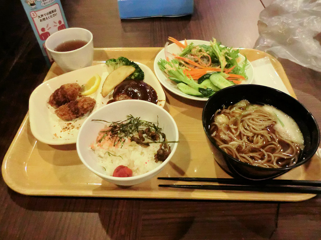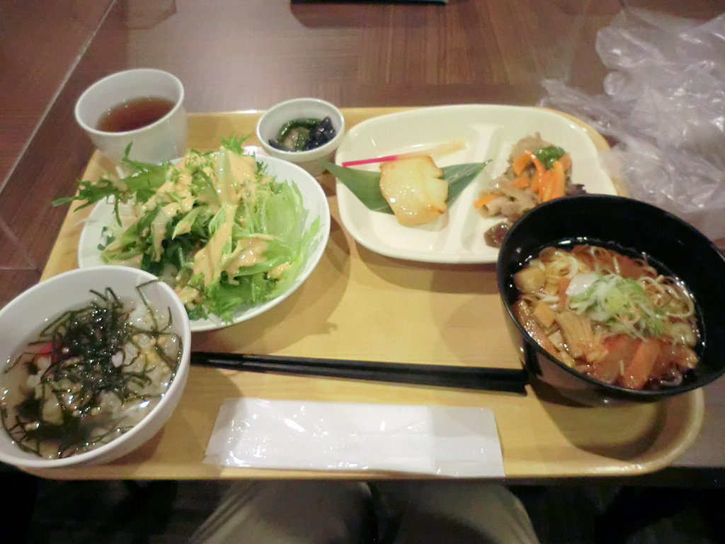 夕食。バイキングではなく受け取り型。ご飯は茶碗を置いて量を選んでボタンを押す自動機械だった。