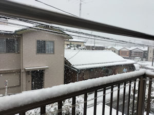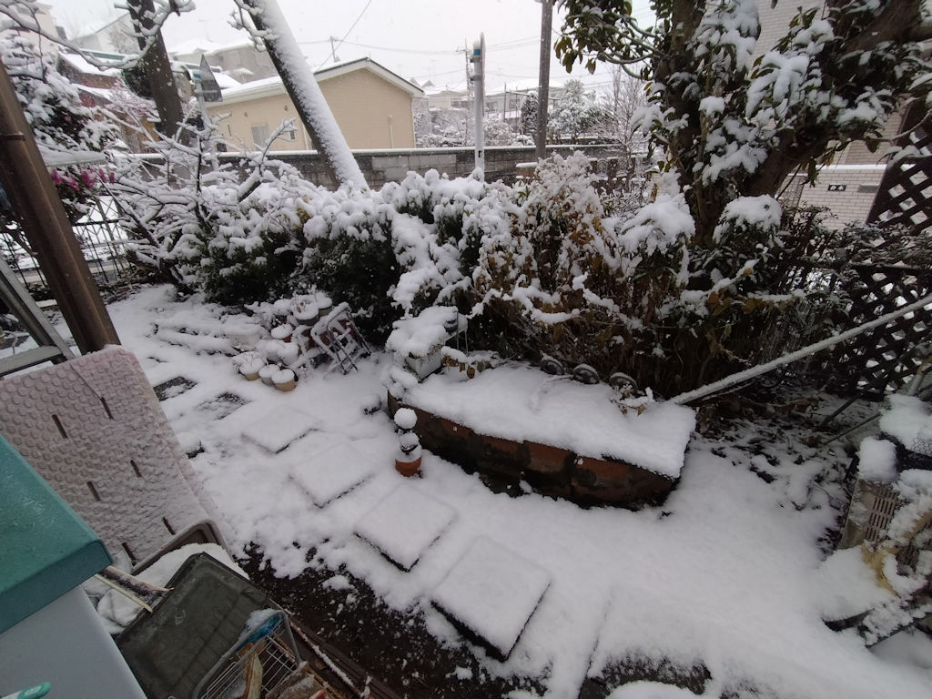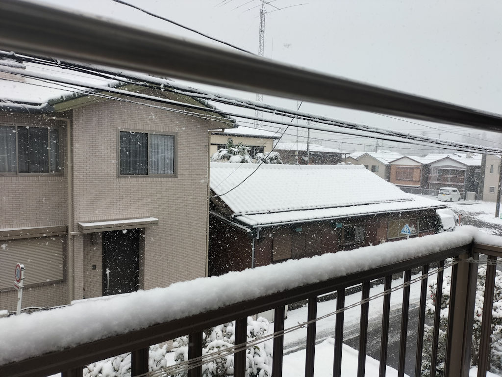 深夜から降り始めていたようだ。午後まで降り続いて、それなりに積もった。ベラbだぼ手すりだと5cm以上になっていた。